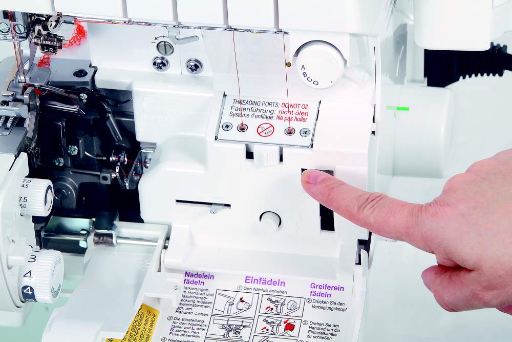 ![]() | Übersichtlich angeordnet sind die Einstellmöglichkeiten für Stichbreite und Stichlänge. Bei geschlossenen oder röhrenförmigen Kleidungsstücken können Sie das Messer ganz leicht und schnell mittels eines Schalters ausschalten und bei Verlangen wieder zuschalten. Als kleine Unterstützung ist das Messer so weit absenkbar, dass ein kleiner Anschlag als Führung übrig bleibt. |