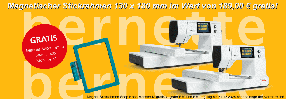 Die b70 DECO ist eine echte Spezialistin. Du hast bereits eine Nähmaschine, willst jetzt aber auch sticken? Diese reine Stickmaschine bietet dir alles, um Kleidung oder Accessoires zu verzieren oder zu personalisieren. Über 200 Stickmotive sind bereits integriert, die du einfach am grossen, farbigen Touchscreen bearbeiten kannst. Per USB-Stick lassen sich weitere Stickmotive hochladen und speichern. Farbiger 5-Zoll-Touchscreen für intuitive Stickmuster-Bearbeitung Einfache und schnelle Bedienung über Multifunktionsknöpfe Stickmodul mit drei Stickrahmen und Stickrahmenerkennung Maximale Stickfläche von 260 x 160 mm für grössere Motive 208 integrierte Stickmotive Alle gängigen Stickmusterformate lesbar Praktische Ober- und Unterfadenüberwachung Einfache & schnelle Bedienung über Touchscreen oder Multifunktionsknöpfe Über den farbigen, zentral platzierten 5-Zoll-Touchscreen lässt sich ganz einfach das gewünschte Stickdesign finden, editieren und per drag & drop positionieren. Mit den Multifunktionsknöpfen kannst du die Grösse und Position deines Stickmusters noch feiner einstellen. Das Stick-Tutorial liefert dir wertvolle Tipps zur Bedienung der Maschine und des Stickmoduls. Stickmodul mit drei Stickrahmen und Stickrahmenerkennung Mit den drei enthaltenen Stickrahmen hast du immer den passenden Rahmen für jede Grösse deiner Stickmotive. Du kannst bis zu 260 x 160 mm grosse Designs ohne umzuspannen aussticken. Die Stickrahmen lassen sich dank eines Schnellverschlusses einfach öffnen und schliessen. Und die automatische Stickrahmenerkennung zeigt dir die entsprechende Stickfläche auf dem Touchscreen an, so dass du dein Stickmuster optimal anpassen kannst. Kreative Vielfalt an Stickmotiven Über 200 Stickmotive und 7 Stickalphabete sind bereits integriert. Per Touchscreen lassen sich die Motive bearbeiten: drehen, spiegeln oder miteinander kombinieren. Du willst mehr? Weitere Stickmuster können per USB-Stick hochgeladen werden. Die b70 DECO ist mit den meisten Stickmusterformaten kompatibel – kein mühsames Konvertieren in einer Sticksoftware mehr nötig. Praktische Ober- und Unterfadenüberwachung Bei leerer Ober- oder Unterfadenspule sorgt die Fadenüberwachung dafür, dass die Maschine sofort den Stickprozess stoppt. So kannst du nahtlos und direkt an der entsprechenden Stelle weitersticken, wenn die Fadenspule wieder voll ist. Nähfussdruck und Oberfadenspannung dem Material anpassen Beim Sticken ist die richtige Fadenspannung sehr wichtig. Bei einigen Materialien, wie zum Beispiel bei leichten und dünnen Stoffen, ist es ratsam, den Nähfussdruck und die Fadenspannung individuell anzupassen. Deine bernette 70 DECO verfügt über diese praktischen Funktionen. Für voluminöse Projekte empfiehlt sich, den auch im Standardzubehör enthaltenen Hüpfer-Stickfuss zu verwenden. Sticken leicht gemacht Dank den Heftstichen ist dein Stoff noch besser auf dem Stickvlies fixiert. Du musst während dem Sticken die Fäden auch nicht mehr einzeln abschneiden – Verbindungsstiche sowie Fäden vor Farbwechsel werden automatisch geschnitten. Noch mehr Komfort Der halbautomatische Nadel-Einfädler macht das Einfädeln zum Kinderspiel – der Nähfuss senkt sich automatisch in die richtige Position ab und der Faden kann zum Einfädeln im seitlichen Fadenabschneider fixiert werden. Features Greifersystem Drop-in Stickfläche 260 x 160mm Anzahl Stickmuster 208 Max. Stickgeschwindigkeit Stiche/Minute 850