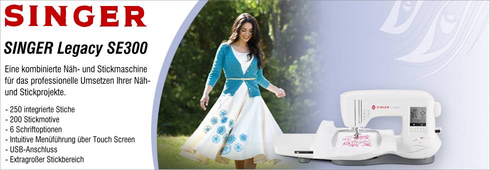 Eine kombinierte Näh- und Stickmaschine - für das professionelle Umsetzen Ihrer Näh- und Stickprojekte Erleben Sie die neue SINGER Legacy Näh- und Stickmaschine. Vorbei sind die Zeiten, in denen Sie sich eine Maschine – mit allen Finessen die Ihr Herz begehrt – herbeigesehnt haben. Diese schlanke, elegante Näh- und Stickmaschine verfügt, neben allen andern Vorteilen, über 250 Stiche, 200 Stickdesigns, 2 Stickschriften und einen USB Stick. Verwandeln Sie jetzt Ihren Stoff in ein Meisterstück! 250 integrierte Stiche, die 10 wichtigsten sind über die Direktwahl ONETOUCH™ aufzurufen. 200 Stickmotive sowie 6 Schriftoptionen - Mit zusätzlicher Sticksoftware zum Download Intuitive Menüführung über LCD Touch Screen Stickmotive lassen sich von Ihrem PC zur Stickmaschine mit dem gelieferten USB Stick übertragen Extragroßer Stickbereich LCD Touchscreen Einstellungsoptionen zum Nähen oder Sticken ganz einfach vornehmen. 200 Embroidery Designs + 6 SchriftoptionenUnbegrenzte Kreativität und Gestaltungsvielfalt durch die vielen Stickdesigns und Schriftvarianten. Extragroßer Näh- und StickbereichPlatz für große Ideen – einmal einspannen und viele Ideen sticken. Aktualisierbare MaschinensoftwareImmer auf dem neuesten Stand sein mit aktueller Maschinensoftware. USB Stick Embroidery Designübertragung Bequem! Stickmotive lassen sich von Ihrem PC zur Stickmaschine mit dem USB Stick übertragen und auf diesem speichern. 2 Stickrahmen enthaltenJe nach Stickprojekt wählen Sie den kleinen (100 mm x 100 mm) oder den großen Stickrahmen (260 mm x 150 mm). Inklusive 10 NähfüßeFür verschiedene Nähtechniken und perfekte Nähergebnisse ist der optimale Nähfuß gleich mit dabei! Die Topfunktionen der SINGER LEGACY SE300 Näh- und Stickmaschine 250 integrierte SticheImmer den richtigen Stich. Die 10 wichtigsten sind über die Direktwahl ONETOUCH™ aufzurufen. Stiche enthalten: 8 Nutzstiche, 7 Stiche für dehnbare Stoffe, 118 dekorative Zierstiche, 14 Knopflochvarianten, genäht in einem Arbeitsgang, 18 Satinstiche, 23 Stiche zum Verlängern, für effektvolle Akzente, 22 Quiltstiche und 30 Hohlsaumstiche. 3 STAYBRIGHT™ LED LichterGut ausgeleuchteter Näh- und Stickbereich. TransporteurversenkungSchöne Stoffoberflächen erstellen mit Freihandnähen! Sie führen und gestalten! Automatische FadenspannungFür schöne Nähergebnisse und Stickresultate auf Ihrem Stoff. LCD TouchscreenEinfach mit den Fingern bedienen! Über den Touchscreen lassen sich so leicht Einstellungsoptionen zum Nähen oder Sticken vornehmen. FadenschneiderMit einem Tastendruck schneiden Sie den Ober- und Unterfaden sauber ab Integrierter NadeleinfädlerPerfekte Unterstützung beim Einfädeln des Oberfadens. Großzügige Nähfläche (200 mm rechts von der NadelViel Platz rechts von der Nadel und ein großzügiger Durchlaß gewähren eine professionelle Handhabung beim Nähen und Sticken, ideal auch für große Projektideen. 800 Stiche in der MinuteIm Nähmodus - für schnelle und präzise Nähresultate 10 Nähfüße gleich mit dabeiFür verschiedene Nähtechniken und Stiche ist der optimale Nähfuß gleich mit dabei! Einfach den Fuß wechseln und perfekte Ergebnisse sind Ihnen garantiert! 200 Embroidery Designsund 6 Schriftoptionen stehen für unbegrenzte Kreativität und Gestaltungsvielfalt. OberfadenwächterSicher ist sicher - kein Oberfaden mehr zum Sticken? Oder der Faden ist gerissen? Mit dem Oberfadenwächter hält Ihre Maschine an und meldet Ihnen den Vorgang. Spuloption während des StickvorgangsWährend des Stickvorgangs können Sie Unterfaden zum Sticken aufspulen, so können Sie nahtlos weiter sticken, sobald von der eingelegten Spule der Faden zu Ende geht. Unterstützt mehrere StickrahmengrößenZusätzlich können Sie die Stickrahmen "Endlos Stickrahmen" 7"x4" und den Stickrahmen der Größe 5"x7" verwenden. Alles was Sie dazu benötigen, ist ein Softwareupdate für Ihre Maschine und schon kann es losgehen. Mit zusätzlicher Sticksoftware zum DownloadenZum grenzenlosen Gestalten Ihrer persönlichen Projekte auf Ihrem PC. Fügen Sie Schrift oder Designs zu neuen Looks zusammen. 2 Stickrahmen im Lieferumfang enthaltenJe nach Stickprojekt wählen Sie den kleinen (100mm x 100mm) oder den großen Stickrahmen (260mm x 150mm). Extragroßer StickbereichPlatz für große Ideen - einmal einspannen und viele Ideen absticken. Hohe StickgeschwindigkeitMit 700 Stichen in der Minute realisieren Sie Ihre Stickprojekte schnell und präzise. Aktualisierbare MaschinensoftwareImmer auf dem neuesten Stand sein mit aktueller Maschinensoftware. USB Stick Embroidery-DesignübertragungBequem! Stickmotive lassen sich von Ihrem PC zur Stickmaschine mit dem USB Stick übertragen und auf diesem speichern. FUNKTIONEN NÄHMODUS 250 integrierte Stiche Komfortable Nähfläche (200m rechts von der Nadel) Integrierter Nadeleinfädler Fadenschneiden auf Knopfdruck Start/Stop-Funktion 3 STAYBRIGHT™ LEDs Lichter Transporteurversenkung LCD Touchscreen 800 Stiche in der Minute 10 praktische Nähfüße im Lieferumfang 200 Embroidery Designs + 6 Schriftoptionen FUNKTIONEN STICKMODUS: Extragroßer Stickbereich 2 Stickrahmen enthalten Unterstützt mehrere Stickrahmengrößen Für mehr kreative Möglichkeiten: Sticksoftware zum Downloaden Aktualisierbare Maschinensoftware Optionale weiterführende Sticksoftware USB Embroidery Stick überträgt Daten vom PC auf Maschine Spulmöglichkeit während des Stickens Oberfadenwächter 700 Stiche in der Minute