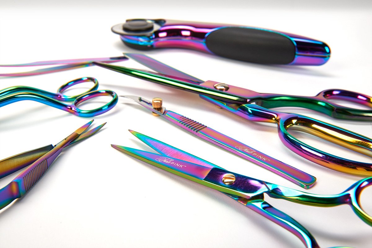 Ein Sortiment erstklassiger Nähwerkzeuge, die in Regenbogenfarben schimmern:
