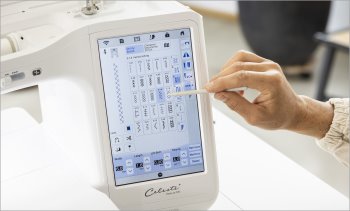 ![]() | Der Stand der Technik Bedienen Sie Ihre CX1 über das 10,1 Zoll große, integrierte High-Definition-LCD-Display. Blättern Sie mühelos durch die Menüs, navigieren Sie intuitiv mit Hilfe der eindeutigen Symbole durch die Maschine oder bearbeiten Sie Ihre Stiche direkt auf dem Touchscreen. |