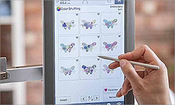 ![]() | Colour Shuffling (Zufällige Farbkombination) Wählen Sie für Stickmuster neue Farbschemata mit erweiterter Funktionalität. Wählen Sie aus den Stilen Zufällig, Abgestuft, Intensiv und Weich und einer Reihe von Farbkombinationen, die auf dem Bildschirm angezeigt werden. Persönliche Präferenzen für die Hauptfarbe können programmiert werden und komplementäre Farbkombinationen werden auf der Grundlage Ihrer Lieblingsfarben erstellt. |