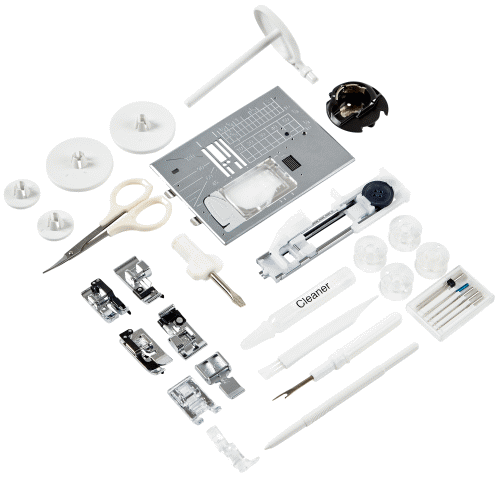 • Zick-Zack Fuß A • Reißverschlussfuß E • Satinstichfuß F • Automatik-Knopflochfuß R • Kantennähfuß C • Overlockfuß M • Blindsaumfuß G • 1/4”-Fuß O • Stickfuß P • Spulenträger für Stickerei • Geradstichplatte • Stickrahmen SQ14e • separater Garnrollenhalter • Stylus für Touchdisplay |