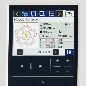 Übersichtlicher, farbiger Tastbildschirm (70,1 x 52,6 mm)Alle Informationen, die Sie zum Sticken und Bearbeiten von Mustern brauchen. Er zeigt das Muster an, bevor Sie anfangen zu sticken. |